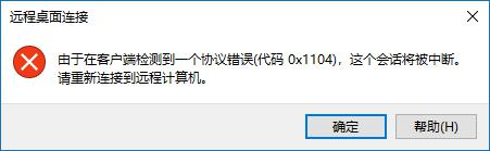 由于在客户端检测到一个协议错误(代码0x1104),这个会话将被中断。请重新连接到远程计算机。
