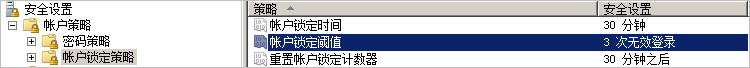 bashC:\inetpub\wwwroot> secedit /export /cfg c:\gp.inf /quiet //导出组策略 C:\inetpub\wwwroot> secedit /configure /db c:\gp.sdb /cfg c:\gp.inf /quiet //导入组策略 C:\inetpub\wwwroot> gpupdate /force //更新组策略 本地安全账户锁定策略项: LockoutBadCount = 3 //账户锁定阈值 ResetLockoutCount = 30 //账户锁定时间 LockoutDuration = 30 //复位账户锁定计数器