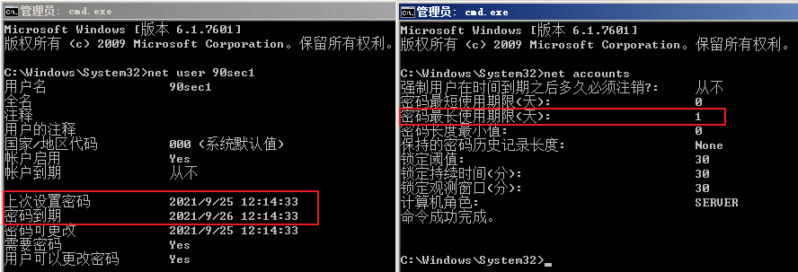 也可以执行以下命令来查看和设置账户策略、指定用户的详细信息等,通过“上次设置密码”和“密码到期”时间来简单判断该用户是否已经过期,如下图。