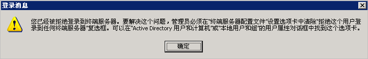 您已经被拒绝登录到终端服务器。要解决这个问题,管理员必须在“终端服务器配置文件”设置选项卡中清除“拒绝这个用户登录到任何终端服务器”复选框。可以在“Active Directory 用户和计算机”或“本地用户和组”的用户属性对话框中找到这个选项卡。(**注:**下图报错提示一般出现在域环境中)
