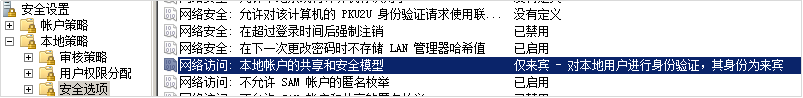 secpol.msc->本地策略->安全选项->网络访问:本地帐户的共享和安全模型->仅来宾 - 本地用户以来宾身份验证,对应的注册表键值为:HKLM\SYSTEM\CurrentControlSet\Control\Lsa的forceguest,0为经典,1为仅来宾。