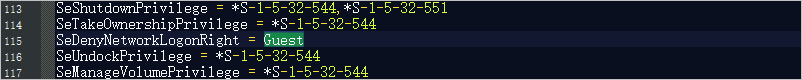 bashC:\inetpub\wwwroot> secedit /export /cfg c:\gp.inf /quiet //导出组策略 C:\inetpub\wwwroot> secedit /configure /db c:\gp.sdb /cfg c:\gp.inf /quiet //导入组策略 C:\inetpub\wwwroot> gpupdate /force //更新组策略 帐户: 来宾帐户状态 EnableGuestAccount = 1 //Guest是否禁用,0为禁用,1为启用