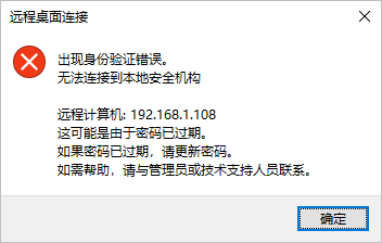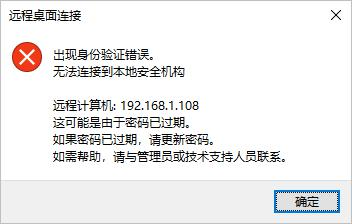 出现身份验证错误。无法连接到本地安全机构。远程计算机:192.168.1.108,这可能是由于密码已过期。如果密码已过期,请更新密码。如需帮助,请与管理员或技术支持人员联系。(2008:仅允许运行使用网络级别身份验证的远程桌面的计算机连接)