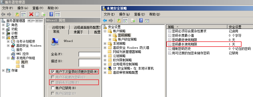 (2) 通过执行以下命令设置密码策略中的“密码最长使用期限”和指定用户的“密码永不过期”;
