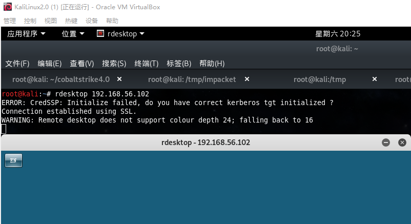 **注:**Windows8.1/2012 R2操作系统上进行RDP-PTH哈希传递攻击时也会出现这种报错,只需通过注册表方式去开启一下Restricted Admin Mode(受限管理模式)就可以了。