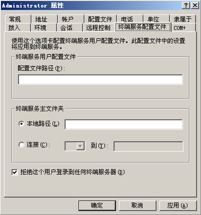 3、在管理员用户的“终端服务配置文件”中将“拒绝这个用户登录到任何终端服务器”选项取消。