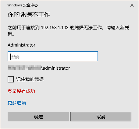 RDP远程桌面连接时输入正确的用户名和密码后还是提示:你的凭据不工作,之前用于连接到192.168.1.108的凭据无法工作。请输入新的凭据。
