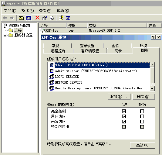 3、"连接"->"RDP-Tcp,tcp,Microsoft RDP 5.2"->"权限"->添加用户或组,授予相关权限。