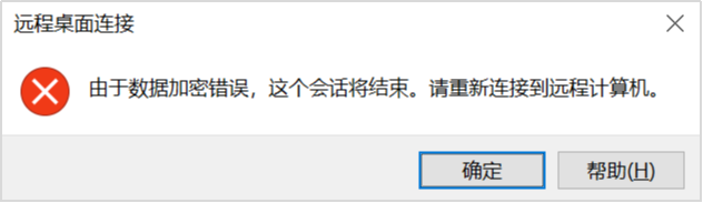 在连接桌面连接时遇到错误"由于数据加密错误,这个会话将结束。请重新连接到远程计算机。"