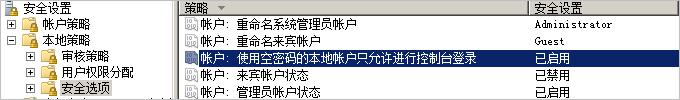 本地安全策略中的“帐户: 使用空密码的本地帐户只允许进行控制台登录”选项,意思是不允许空密码的本地账户进行远程登录。≥2008这两个选项默认为已启用状态。
